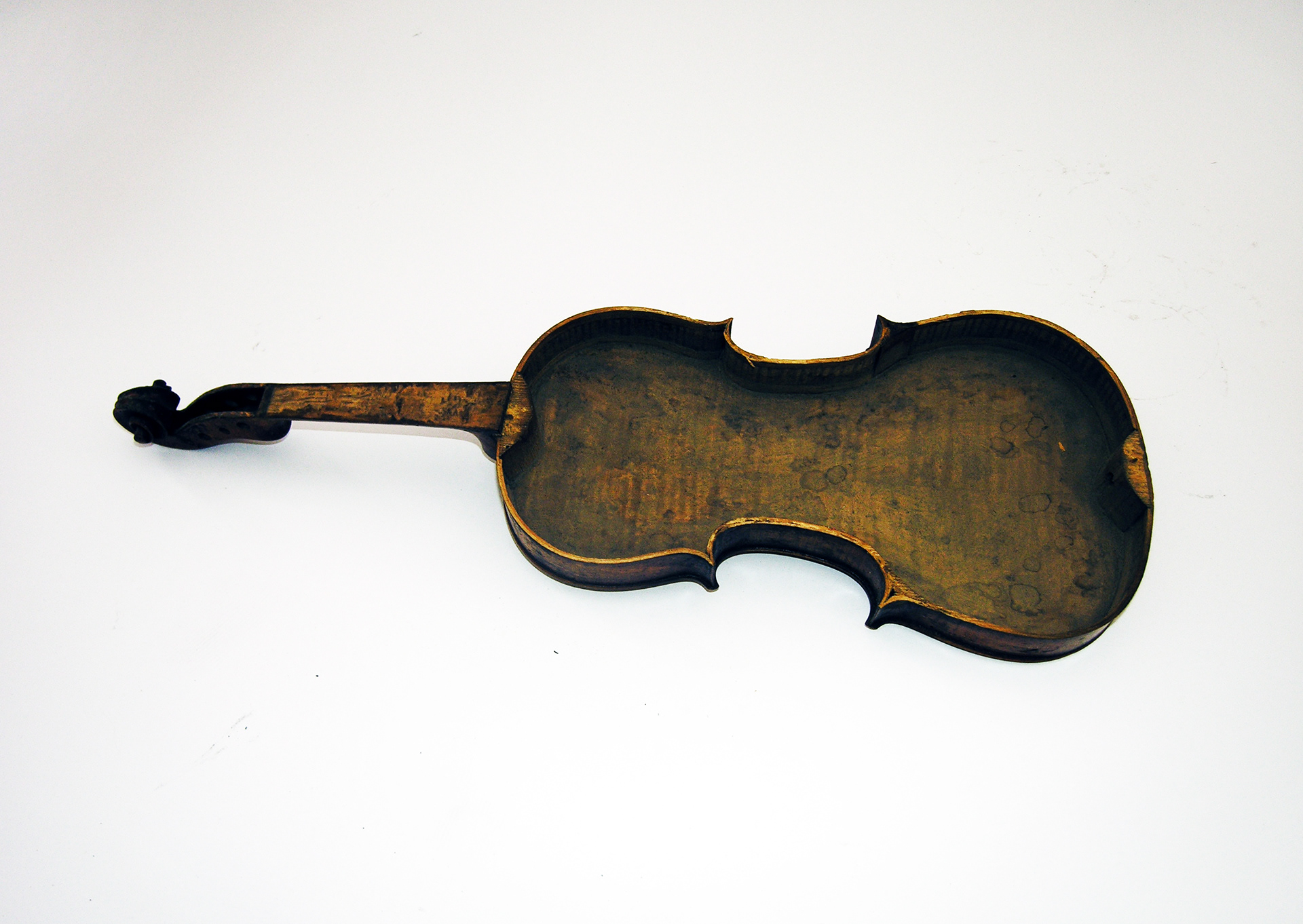 Skrzypce w większości zniszczone. Nie nadają się do użytkowania, mogą służyć jedynie jako eksponat. Pokrywa wierzchnia całkowicie zniszczona przez kołatki - impregnowana paraloidem B72 w toluenie, podklejona fizeliną.