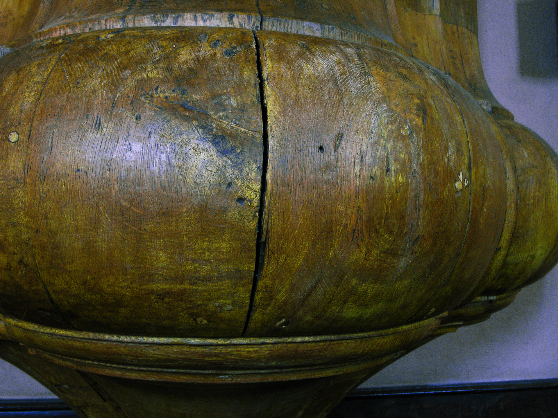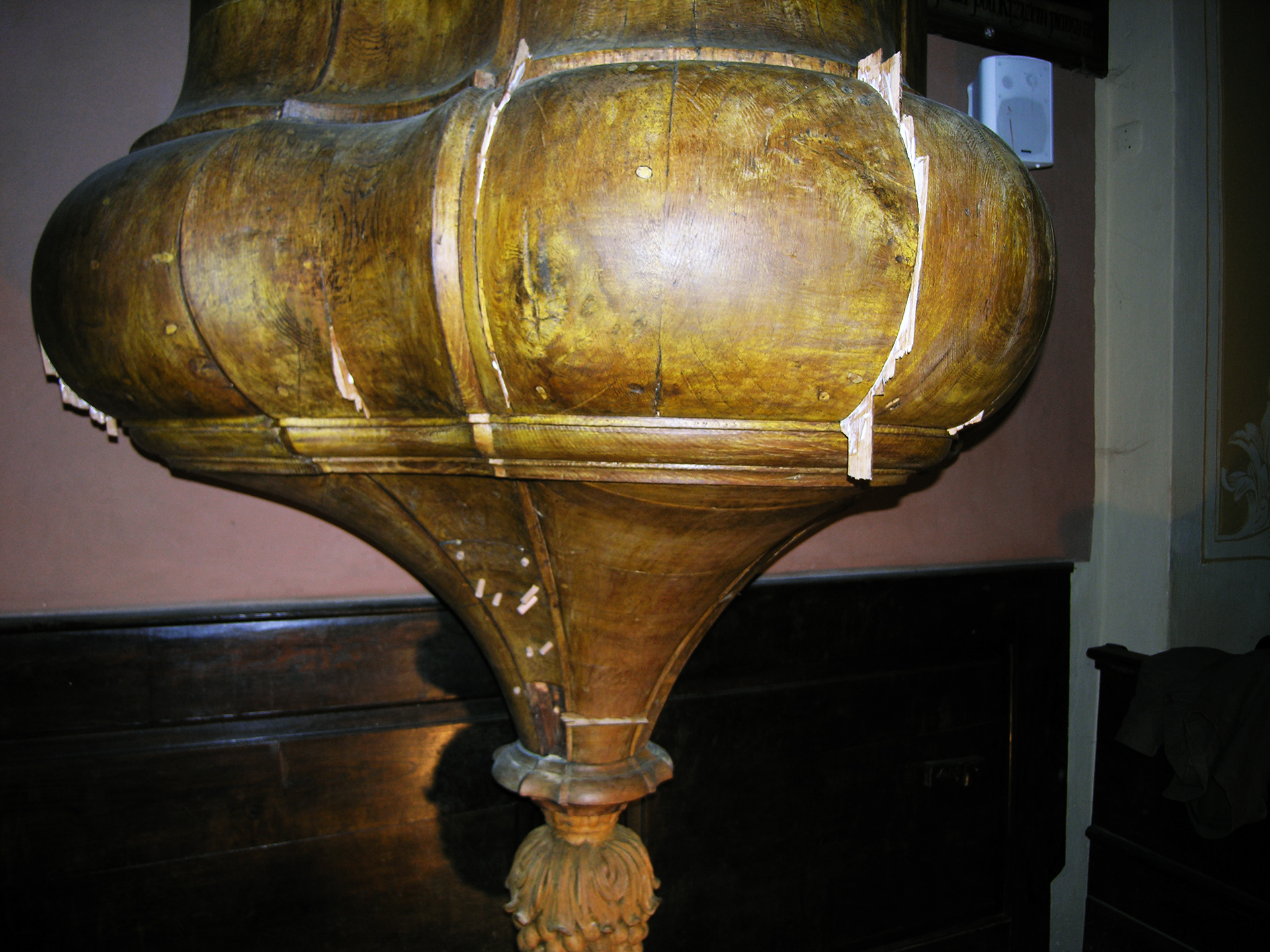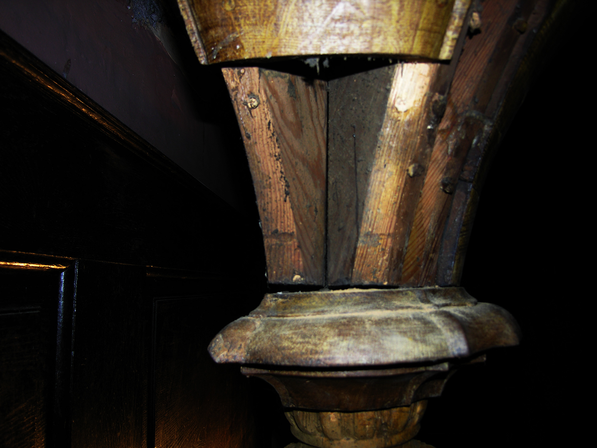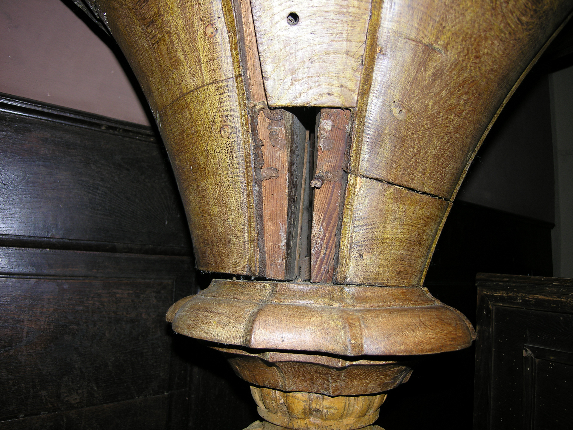 Uszkodzona konstrukcja. Liczne szczeliny powstałe w wyniku przesuszenia powietrza. Ubytki masywu - okładziny i listw profilowanych. Kołki mocujące okładzinę uszkodzone przez żerujące larwy kołatków.